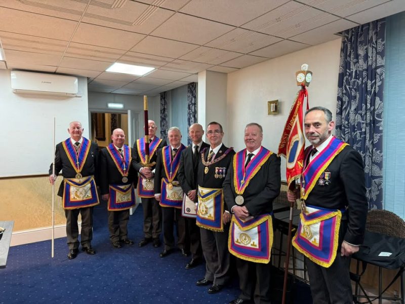 A foggy night in Slouwit beset with problems, but they did not detract from a fabulous evening. First W Bro John M Fitzpatrick’s noddy car let him down. Then our ProvGSec had to pull out, coupled with the intrepid duo from Harrogate – W Bro’s Edward Wilkinson and Andrew Johnson sat still on the motorway for several hours behind a serious accident before eventually turning round then headed for home.